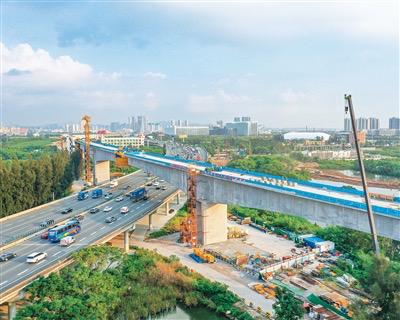 Recently, at the construction site of the main bridge spanning the Riverside Expressway in the Dongguan section of the Shenzhen-Jiangmen High Speed Railway in Dongguan city, Guangdong province, workers have been orderly advancing bridge construction, pushing forward at full throttle towards the bridge closure milestone. As a core project of the "half-hour economic zone" in the Guangdong-Hong Kong-Macao Greater Bay Area, the Shenzhen-Jiangmen High Speed Railway will reduce travel time between Jiangmen and Shenzhen to under one hour upon its opening. It will also connect with the Guangzhou-Shenzhen-Hong Kong High Speed Railway, playing a significant role in further developing a "Greater Bay Area with a comprehensive rail network."