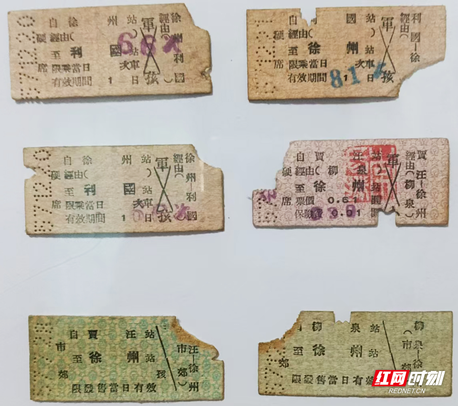 這里還有全國獨一無(wú)二的通往韶山的列車(chē)“特價(jià)客票”,也有1957年僅使用過(guò)半年多的簡(jiǎn)體字與繁體字混合在一起的特殊火車(chē)票。除此之外,一組6張第一代火車(chē)票更是引起了眾多參觀(guān)者尤其是年輕人的注意:僅有大拇指那么大的小小硬紙板卡片的一端,有著(zhù)密密麻麻的細小針孔,那些排列有序的針孔顯現出兩個(gè)一組的阿拉伯數字。懂行的人說(shuō),這幾個(gè)數字代表著(zhù)乘客“限當日發(fā)售乘車(chē)有效”所持車(chē)票的具體日期。而陳列館里展示的那幾張火車(chē)票,第一組數字都是“57”,而且票面上全部是如今大多數人認不全的繁體字,表明它們大都是1957年12月從徐州至賈旺,柳泉至利國等不同的火車(chē)站售出的老火車(chē)票。