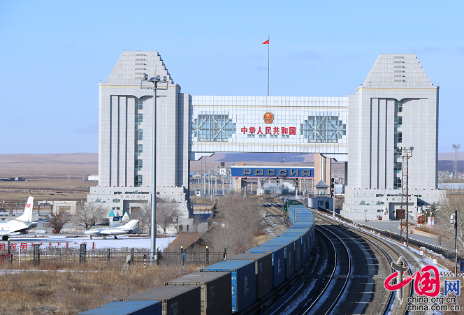為滿(mǎn)洲里鐵路口岸站,一列中歐班列從國門(mén)通過(guò)。果乃倫攝